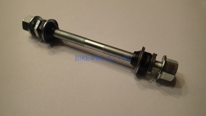 Oś przedniej piasty, średnica fi 8mm, długość 123mm. W komplecie konusy i nakrętki