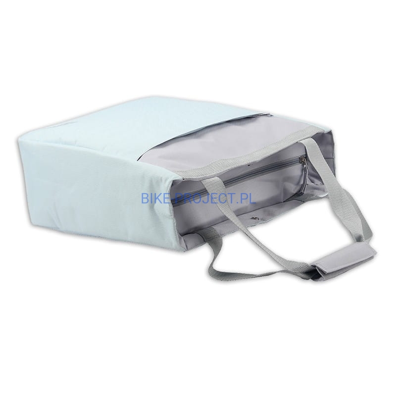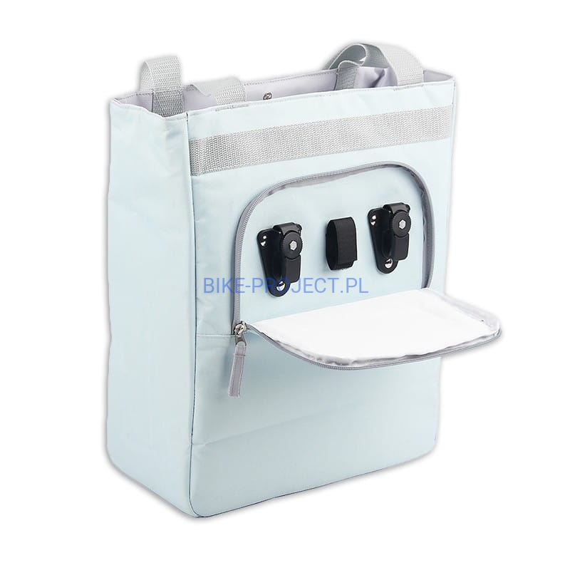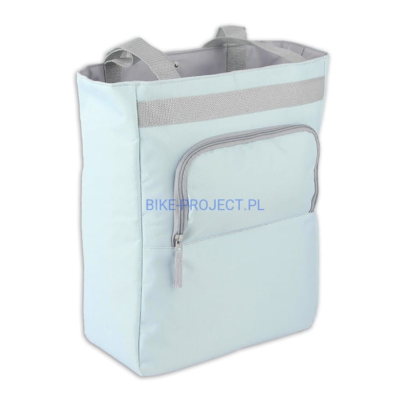 Ta torba termiczna w kolorze miętowo-szarym ma pojemność 17 litrów, jest wyposażona w przednią kieszeń zapinaną na zamek i można ją łatwo przymocować do bagażnika rowerowego dzięki regulowanym haczykom.